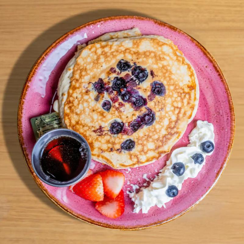 Slices of our delicious French toast, covered in powdered sugar, strawberries, and blueberries, with a little bit of caramel & chocolate drizzle